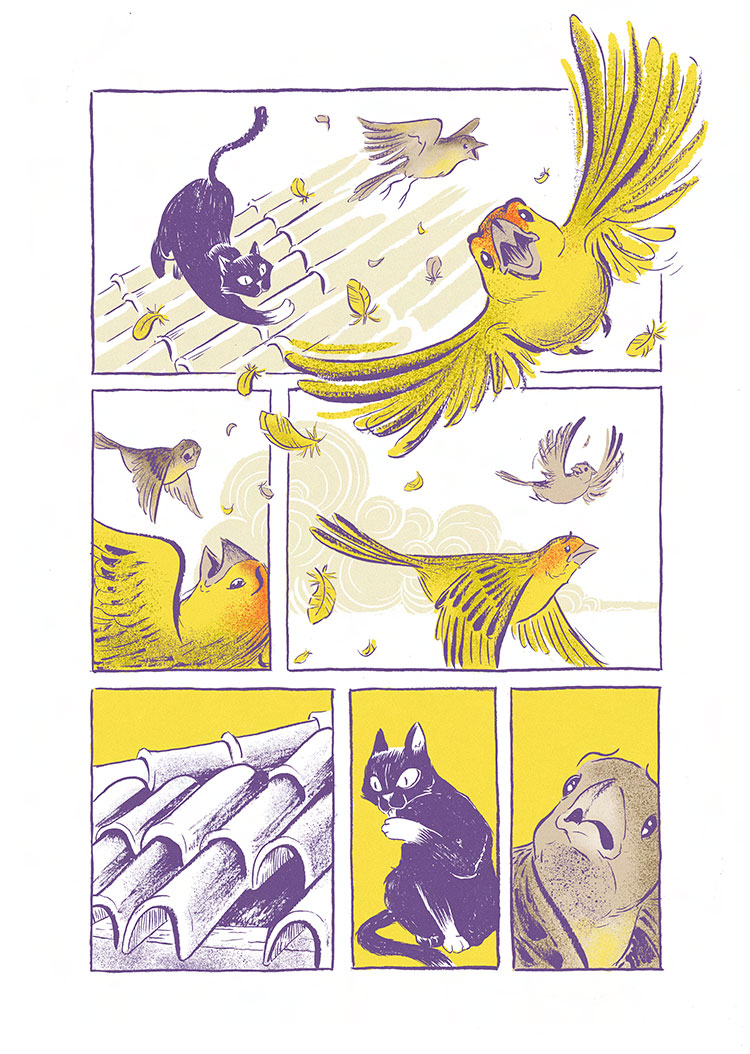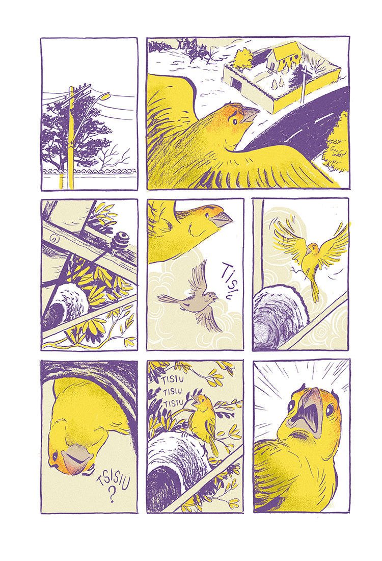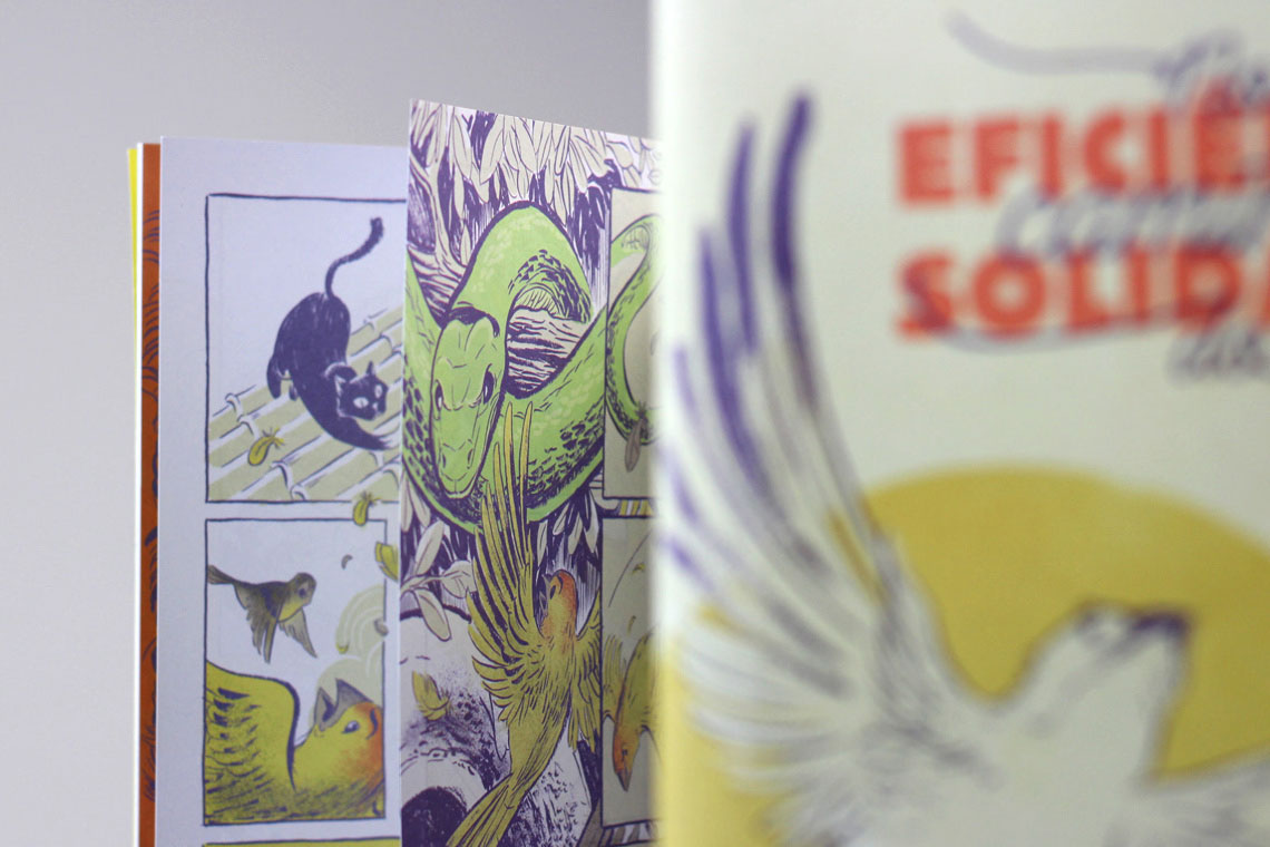 Para o relatório anual, o projeto escolheu os quadrinhos como forma de apresentar os números e os serviços prestados no último ano. Tive a alegria de contar a história de dois pequenos passarinhos que, por ventura, cruzam o caminho do escritório móvel do projeto.