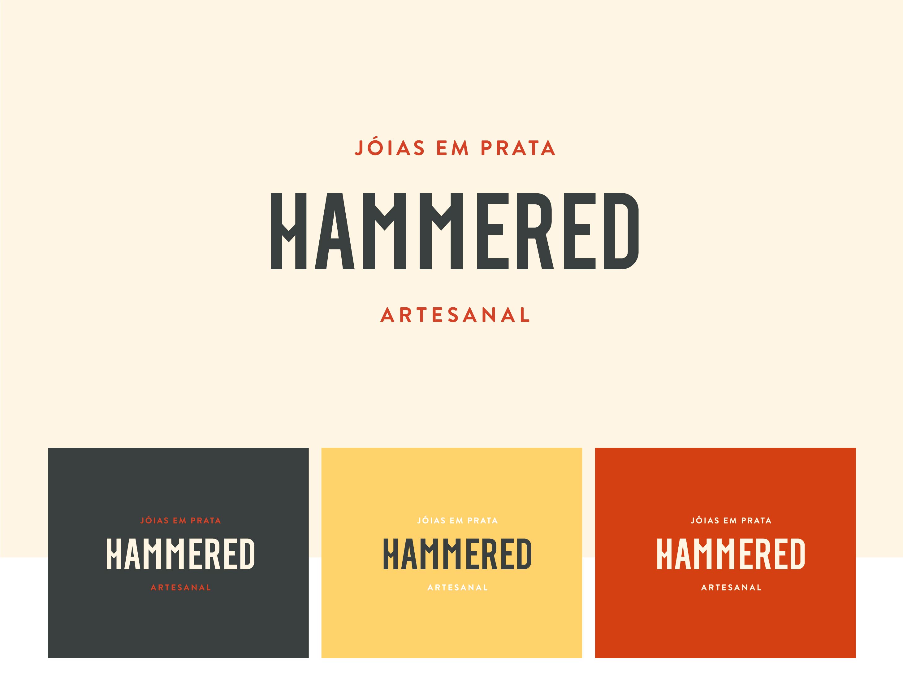 A Hammered jóias, trabalha com objetos em prata de maneira artesanal. Cada peça é única, feita com primor aos detalhes pelas mãos de Jabes Fonseca. As influências artísticas, do rock à cultura nerd, transparecem em suas obras de forma espontânea e irreverente. A representação gráfica da marca busca transmitir o primor do trabalho manual através de tipografias inspiradas nos movimentos arts and crafts do sec. XIX. Combinadas à cores saturadas e ao poder da ilustração, projetamos uma identidade visual que equilibra PRIMOR, ESPONTANEIDADE e IRREVERÊNCIA, que se deixa rir e levar a vida leve, mas compreendendo que rir de tudo é desespero.