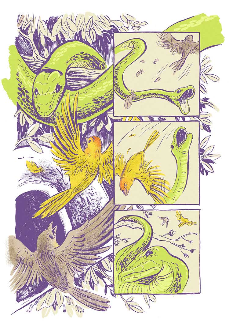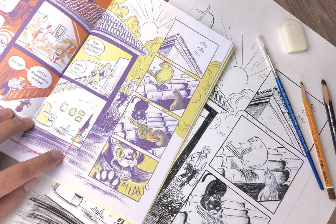 Para o relatório anual, o projeto escolheu os quadrinhos como forma de apresentar os números e os serviços prestados no último ano. Tive a alegria de contar a história de dois pequenos passarinhos que, por ventura, cruzam o caminho do escritório móvel do projeto.