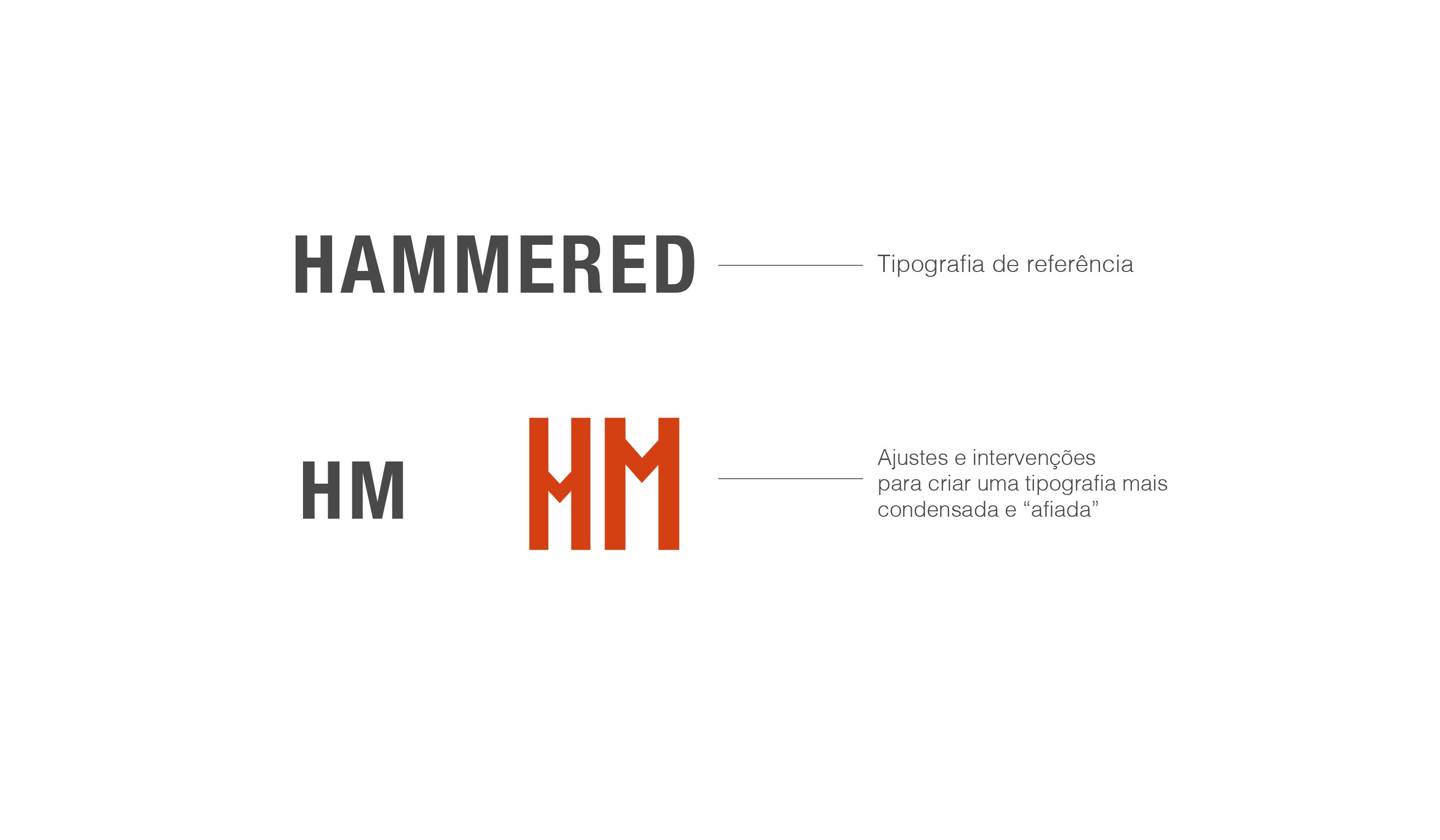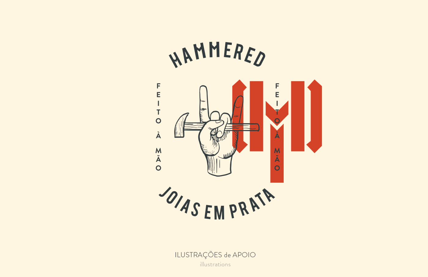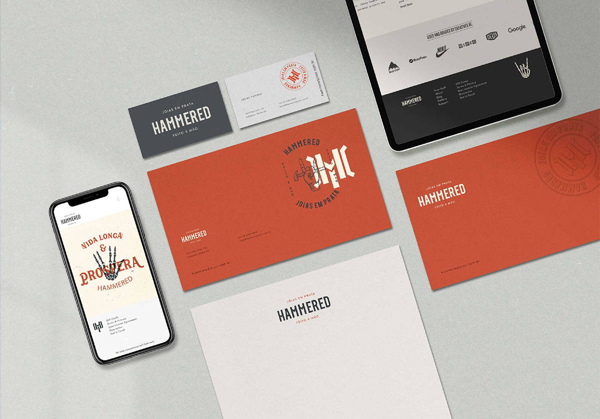 A Hammered jóias, trabalha com objetos em prata de maneira artesanal. Cada peça é única, feita com primor aos detalhes pelas mãos de Jabes Fonseca. As influências artísticas, do rock à cultura nerd, transparecem em suas obras de forma espontânea e irreverente. A representação gráfica da marca busca transmitir o primor do trabalho manual através de tipografias inspiradas nos movimentos arts and crafts do sec. XIX. Combinadas à cores saturadas e ao poder da ilustração, projetamos uma identidade visual que equilibra PRIMOR, ESPONTANEIDADE e IRREVERÊNCIA, que se deixa rir e levar a vida leve, mas compreendendo que rir de tudo é desespero.